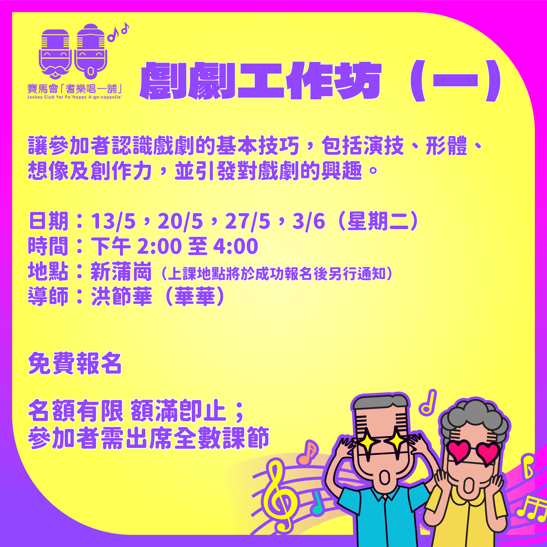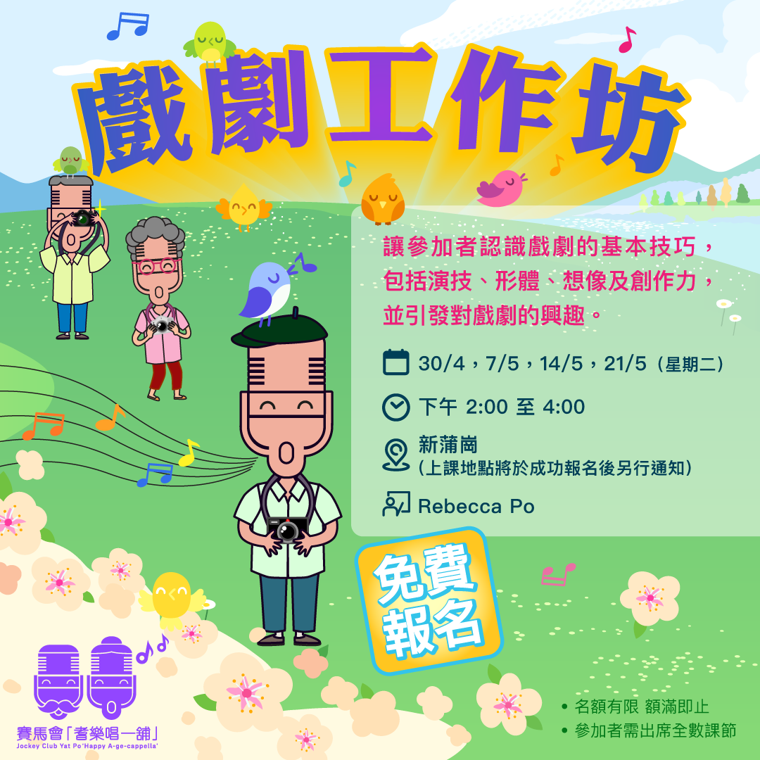 藝術無分界限!不論音樂、戲劇、及舞蹈等,也是美麗人生的精神食糧!來參加我們的藝術工作坊吧!