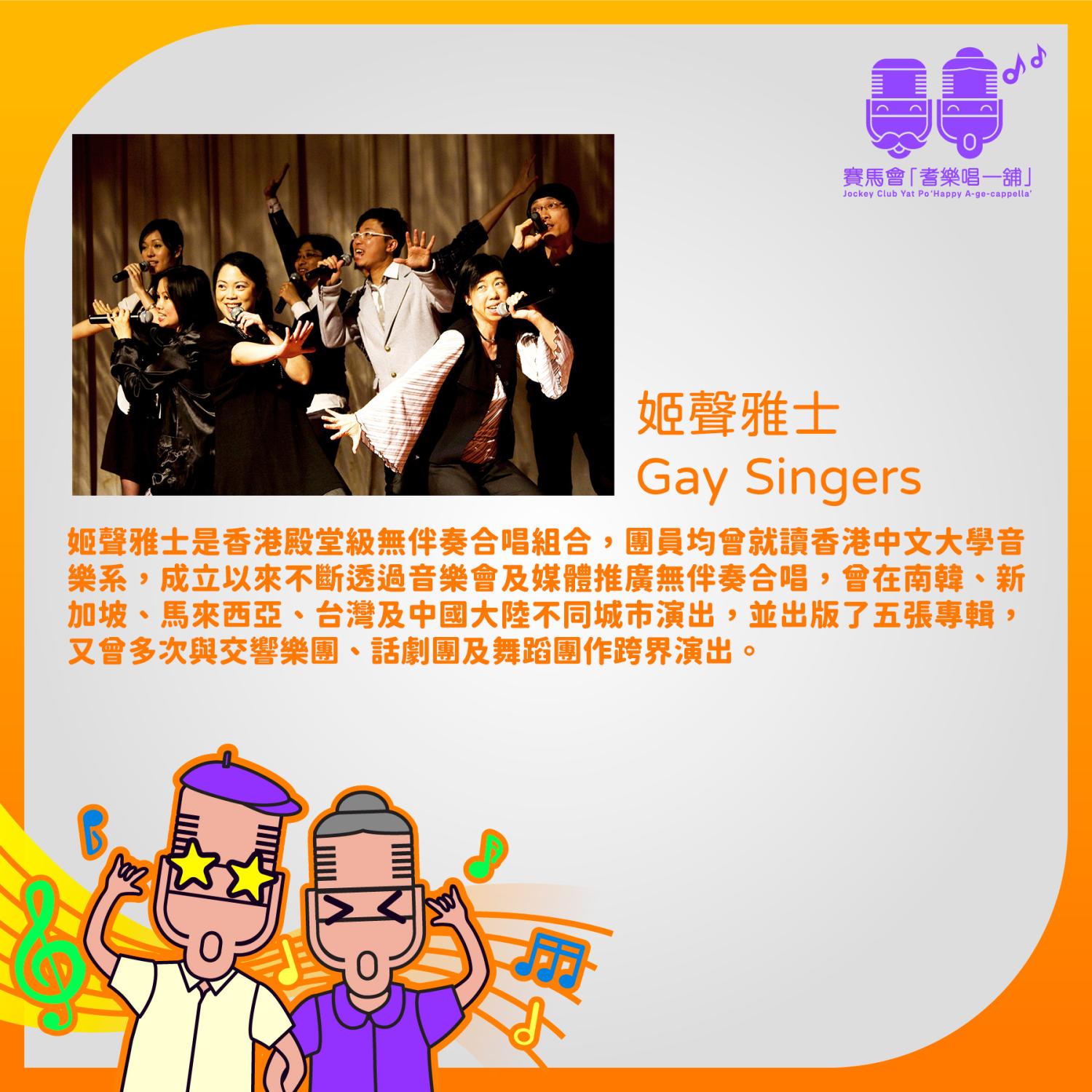 日期:9/10,16/10,23/10,30/10(星期四) 時間:下午 4:00 至 6:00 地點:新蒲崗(上課地點將於成功報名後另行通知) 導師:姬聲雅士成員 (Gay Singers)